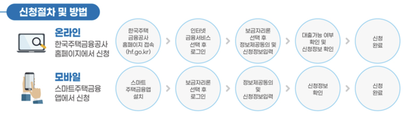 | 신청방법 | 한국주택금융공사 - 심사정보입력 - 서류제출 - 심사및승인 - 실행 |