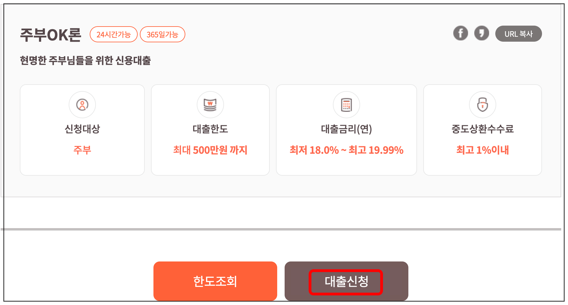 | 대출금리 | 연 18% ~ 연 19.99% *개인신용평점 등에 따라 차등적용 |