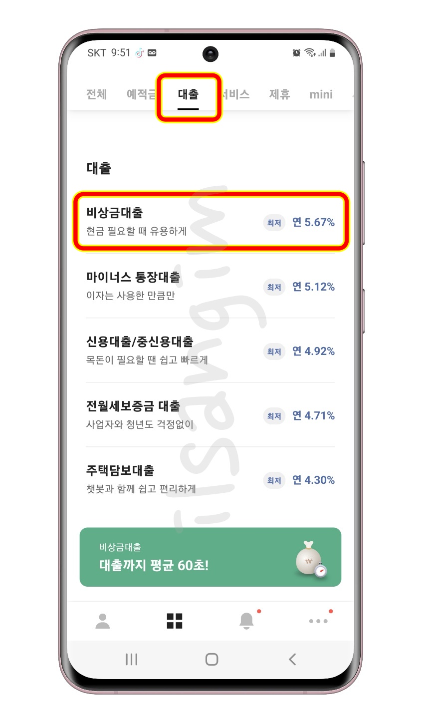 step 3. 상단 메뉴 중, [대출]을 선택합니다. 그리고 [비상금대출]을 선택하세요.