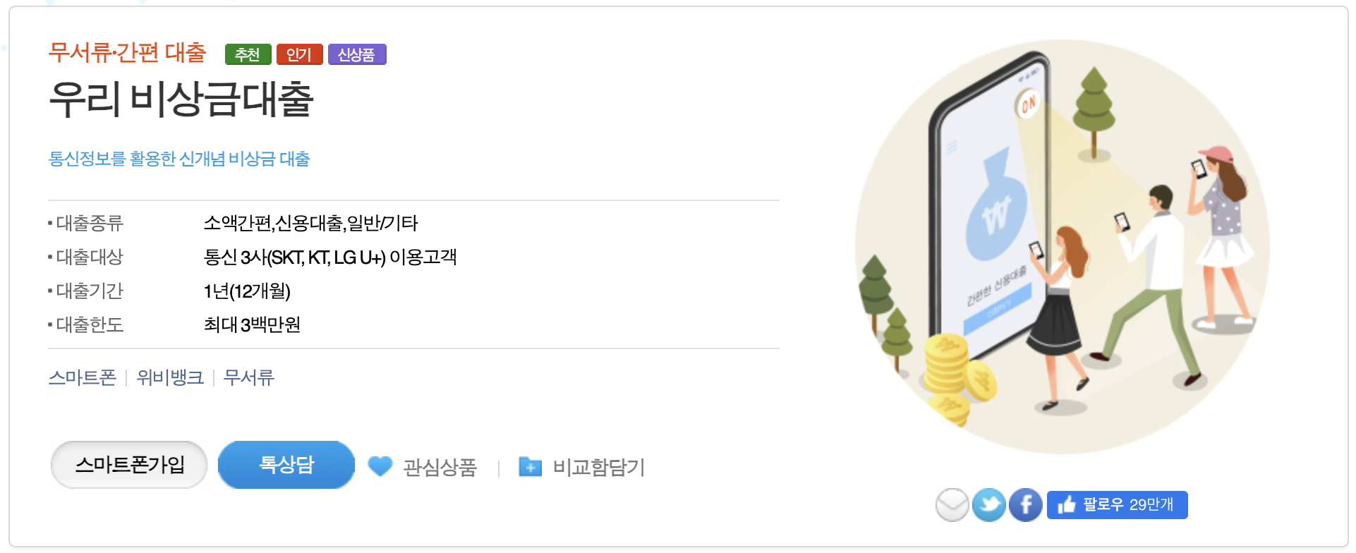 하지만 이 상품은 대출한도가 적은 편입니다. 소액대출이 필요하신 분들이 사용하기 적합합니다. 그리고 SKT, KT, LG U+ 통신사를 사용하는 분들만 이용이 가능하여 알뜰폰을 사용하시는 분들은 이 비상금대출을 이용할 수 없습니다.